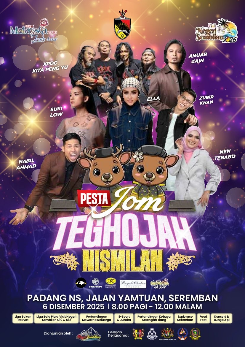 Get ready to celebrate Pesta Jom Teghojah Nismilan in conjunction with Visit Negeri Sembilan Year 2026! Join us at Padang NS, Jalan Yam Tuan, Seremban on 6 December 2025, from 8 AM all the way till midnight for a full day of excitement! Catch your favourite singers lighting up the stage at the Pesta Jom Teghojah Nismilan Concert, along with vibrant and colorful cultural performances that showcase the true spirit of Negeri Sembilan!